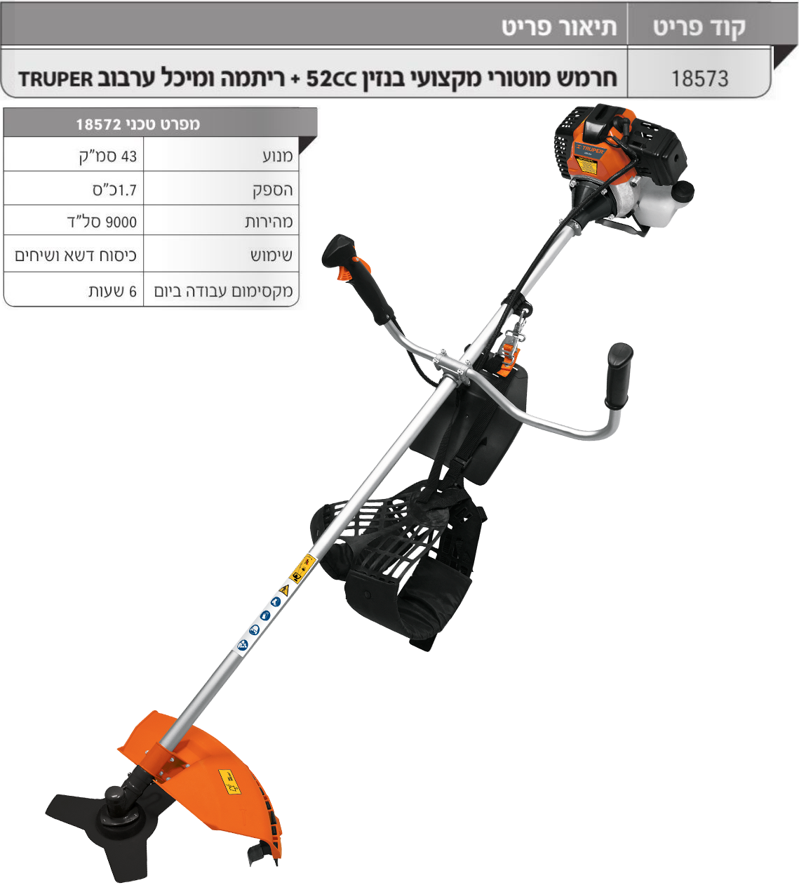 >> חרמש מוטורי 43CC בנזין עם ריתמה ומיכל ערבוב מבית TRUPER